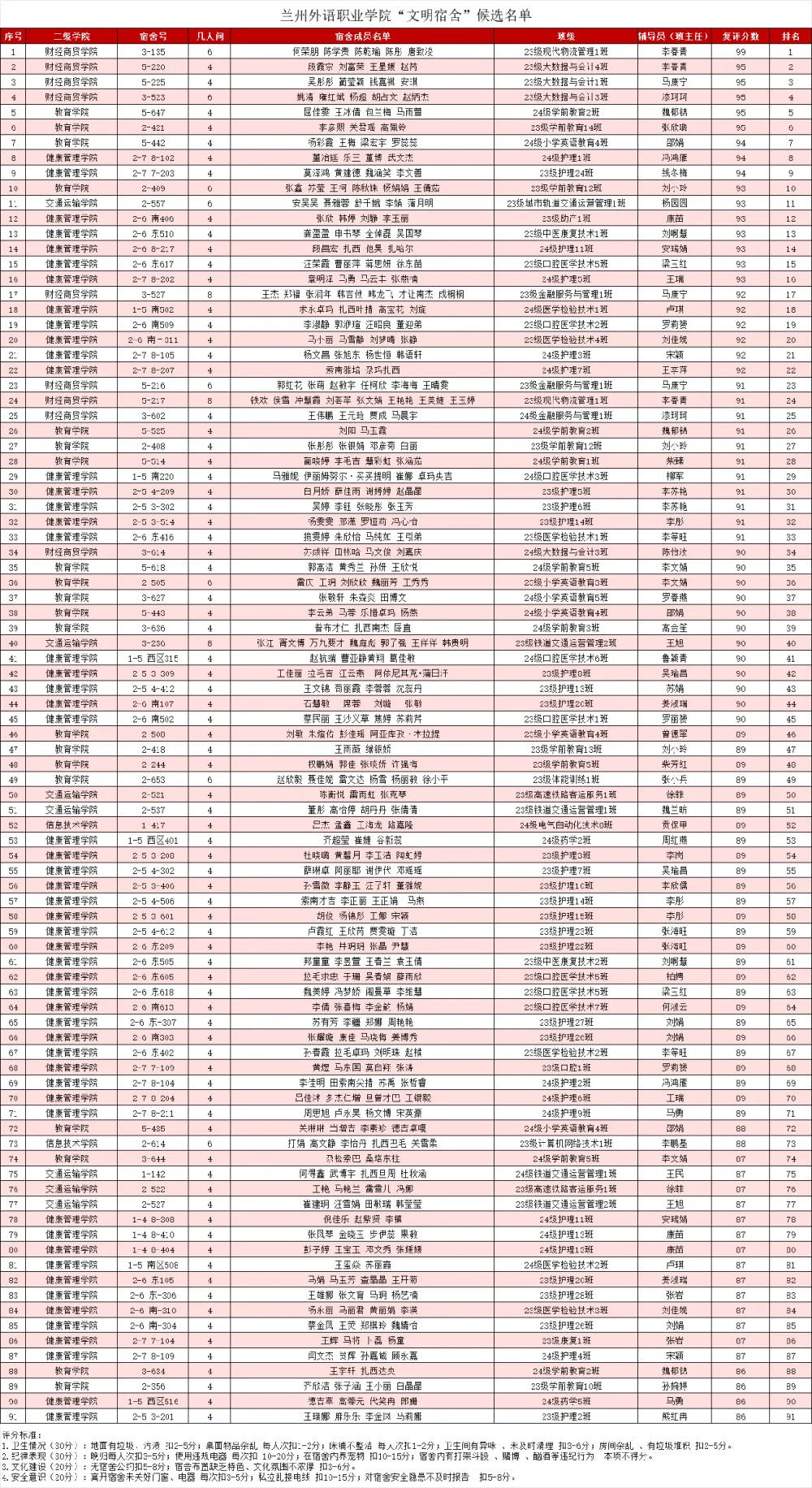 为营造整洁、舒适、安全、和谐的住宿环境,学校通过“一站式”学生社区建设培养学生良好的生活习惯和道德风尚,特举办"文明宿舍"评选活动。评选工作注重宿舍的日常表现和整体风貌,全面考量宿舍在卫生、纪律、文化建设等方面的成效。根据《OD网页版“文明宿舍”评选管理办法》,经宿舍自评、二级学院初步审核、学院实地检查、综合评定,拟评选出“文明宿舍”91间,现进行公示。