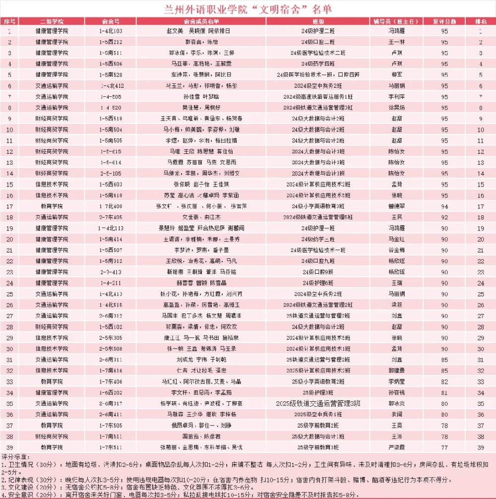 为营造整洁、舒适、安全、和谐的住宿环境,学院通过“一站式”学生社区建设培养学生良好的生活习惯和道德风尚,特举办"文明宿舍"评选活动。评选工作注重宿舍的日常表现和整体风貌,全面考量宿舍在卫生、纪律、文化建设等方面的成效。根据《OD网页版“文明宿舍”评选管理办法》,经宿舍自评、二级学院初步审核、学院实地检查、综合评定,拟评选出“文明宿舍”39间,现进行公示。
