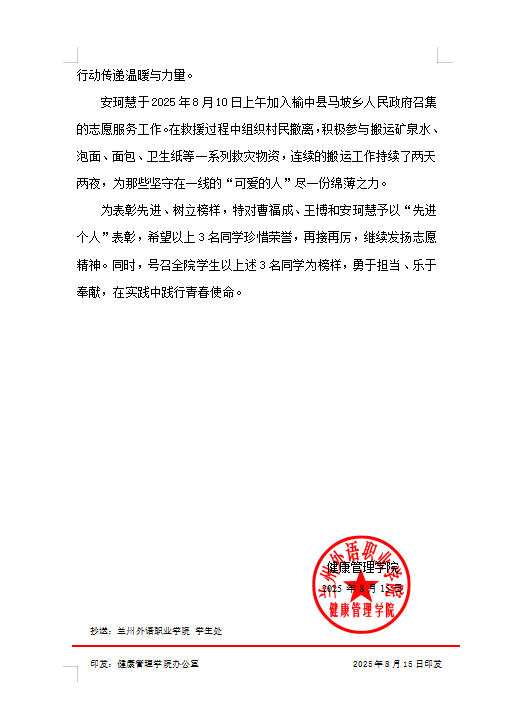近日,兰州市榆中县遭遇强降雨引发的洪涝灾害,多地受灾严重。危难时刻,OD网页版健康管理学院2024级护理6班的曹福成同学挺身而出,奔赴救灾一线,以实际行动诠释了新时代青年的责任与担当。