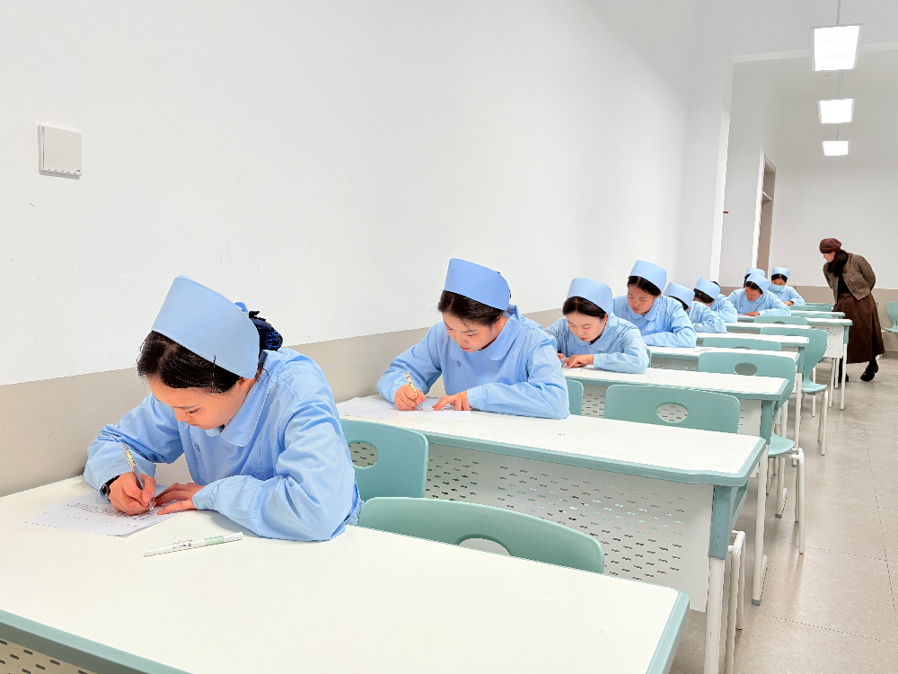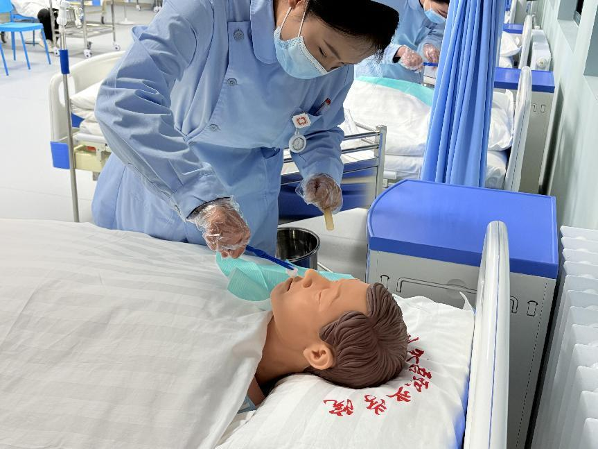 比赛采用“理论+实操”双重考核体系。理论笔试聚焦护理核心知识,选手专注作答,评委严谨批阅后筛选出理论扎实者晋级;实操环节中,选手身着规范服饰,严格按流程完成口腔护理、无菌操作等项目,沟通时温和亲切,尽显专业与人文关怀。