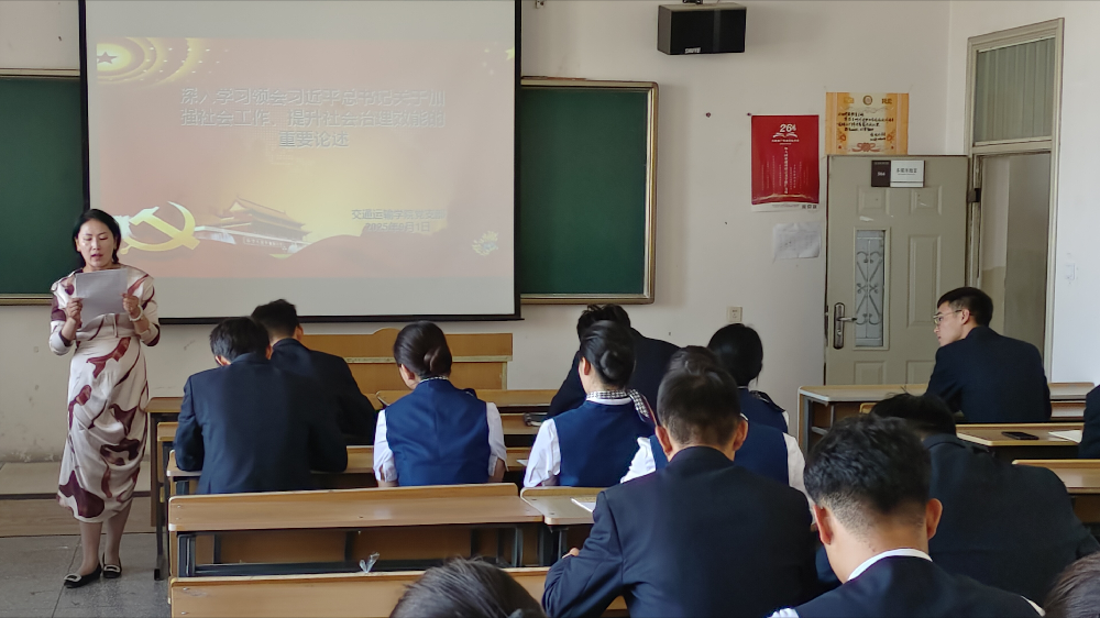 9月1日下午, 交通运输学院党支部书记丁思含带领30期预备党员和31期入党积极分子,在2号教学楼504教室针对“深入学习领会习近平总书记关于加强社会工作、提升社会治理效能的重要论述”进行深入学习。