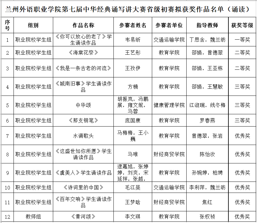 交通运输学院韦易昕作品《你可以放心的老了》荣获“诵读中国”经典诵读大赛省级初赛职业院校组一等奖,丁思含、魏兰昉两位老师获得省级初赛优秀指导教师奖;教育学院王艺彤作品《海棠花祭》、王孜伊作品《我是一条古老的河流》荣获“诵读中国”经典诵读大赛省级初赛职业院校组二等奖;教育学院方楠作品《城南旧事》、庞国康作品《那只钢笔》、健康管理学院胡振岚团队作品《中华颂》荣获“诵读中国”经典诵读大赛省级初赛职业院校组三等奖;教育学院马梅梅团队作品《水调歌头》、逯嘉旭团队作品《虞美人》、财经商贸学院马唯作品《这盛世如你所愿》、王梦晗作品《百年交响》、交通运输学院毛江斐作品《诗词里的中国》荣获“诵读中国”经典诵读大赛省级初赛职业院校组优秀奖;教育学院李文琪作品《黄河颂》荣获“诵读中国”经典诵读大赛省级初赛教师组优秀奖。获奖名单如下: