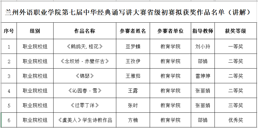 教育学院豆梦蝶作品《鹧鸪天.桂花》荣获“诗教中国”经典诗词讲解大赛省级初赛职业院校组一等奖,刘小玲老师获得省级初赛优秀指导教师奖;教育学院王孜伊作品《念奴娇·赤壁怀古》、王雅茹作品《锦瑟》、王露作品《沁园春·雪》荣获“诗教中国”经典诗词讲解大赛省级初赛职业院校组二等奖;教育学院张时作品《过零丁洋》荣获“诗教中国”经典诗词讲解大赛省级初赛职业院校组三等奖;教育学院方楠《虞美人》荣获“诗教中国”经典诗词讲解大赛省级初赛职业院校组优秀奖。获奖名单如下: