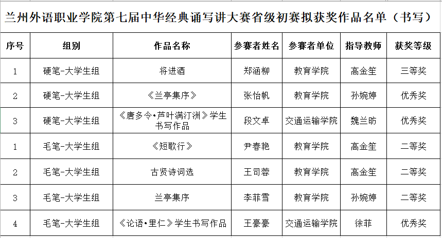 教育学院郑涵柳作品《将进酒》荣获“笔墨中国”汉字书写大赛大学生组(硬笔)三等奖;教育学院张怡帆作品《兰亭集序》、交通运输学院段文卓作品《唐多令•芦叶满汀洲》荣获“笔墨中国”汉字书写大赛大学生组(硬笔)优秀奖;教育学院尹春艳作品《短歌行》、王司蓉作品《古贤诗词选》、李菲雪作品《兰亭集序》荣获“笔墨中国”汉字书写大赛大学生组(毛笔)二等奖;交通运输学院王豪豪作品《论语•里仁》荣获“笔墨中国”汉字书写大赛大学生组(毛笔)优秀奖。获奖名单如下: