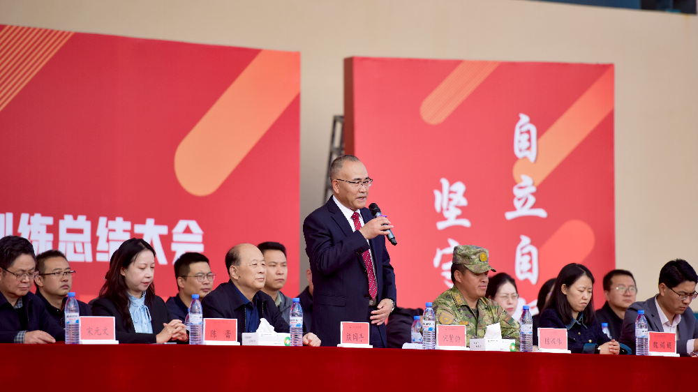党委书记殷国手向承训部队赠锦旗,对全体承训教官“青春无悔献国防”的使命担当和“言传身教育栋梁”的辛勤付出表示衷心感谢。